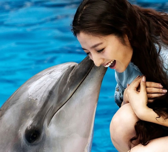 潘辰海洋館甜美寫真 與海豚親密接觸盡顯可愛